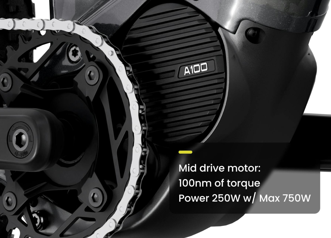 Motor | Aventon a100 mid-drive, 36V, 250W sustained, 750W peak, 100Nm torque, IP67 rating |